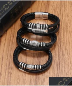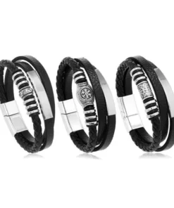 Modern kialakítású férfi karkötő, ideális alkalmi vagy smart-casual megjelenéshez. Több fekete műbőr szalagból áll, köztük egy fonott részből, amelyet fényes fém részletek egészítenek ki, amelyek elegáns kontrasztot adnak. Középen egy dekoratív, gravírozott mintás elem található a további kifinomultság érdekében. Biztonságosan rögzíthető egy könnyen kezelhető fémcsattal. Inspiráló választás olyan férfiak számára, akik egy különleges kiegészítővel szeretnék kiegészíteni mindennapi öltözéküket.