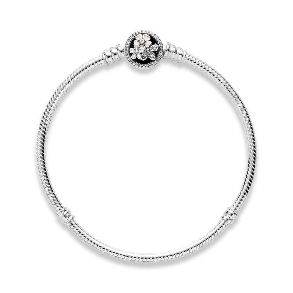 Fedezze fel a klasszikus Pandora-stílusú karkötő egyszerű eleganciáját, kerek kapcsával, amelyet finom, rózsaszín árnyalatú virágmintával díszítettek. Ez a karkötő ideális a mindennapi viselethez vagy különleges alkalmakra, és tökéletes alapot nyújt saját, személyre szabott charmgyűjteményének összeállításához.