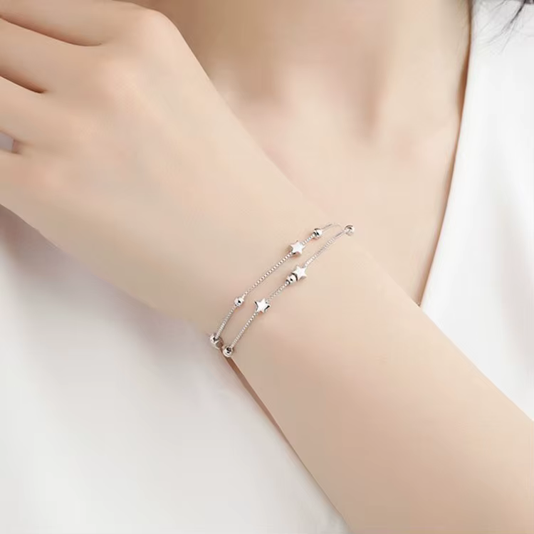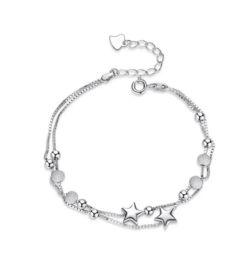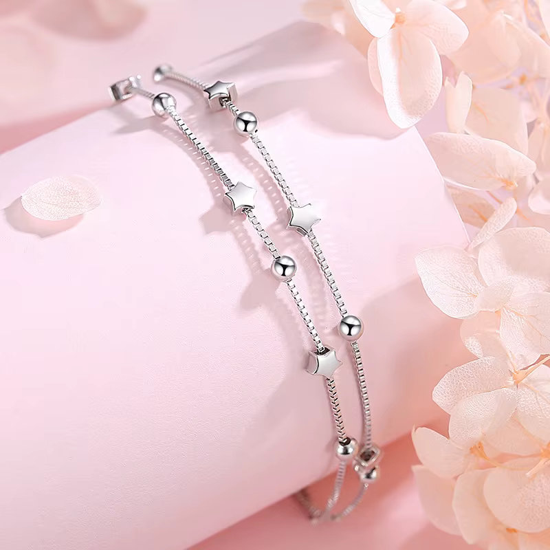 A karkötő finom dupla lánccal készült, amely kifinomult és modern látványt nyújt. A csillogó csillagok és szikrázó gömbök formájú díszítőelemek különleges bájt kölcsönöznek, amely egy tiszta éjszakán a csillagos égboltra emlékeztet.
