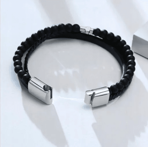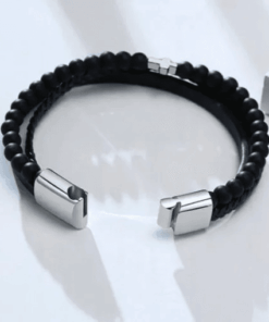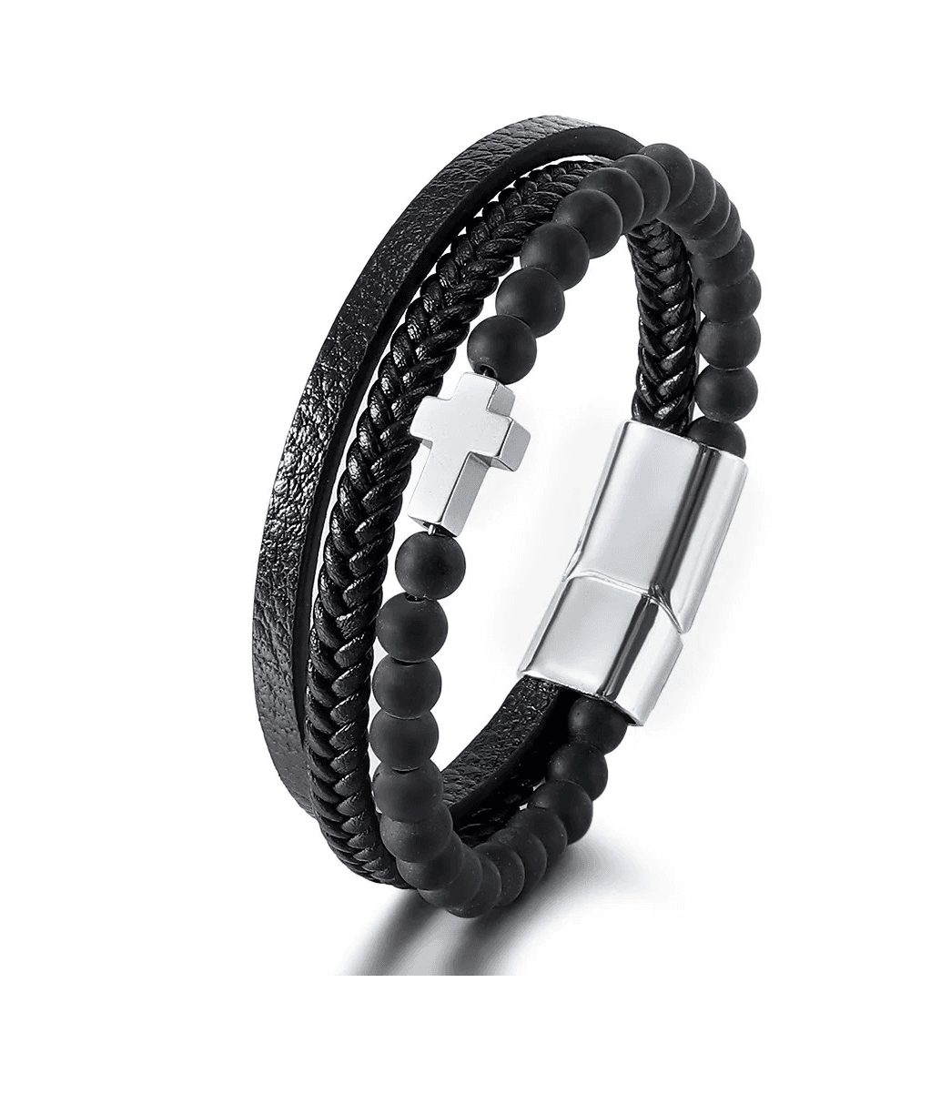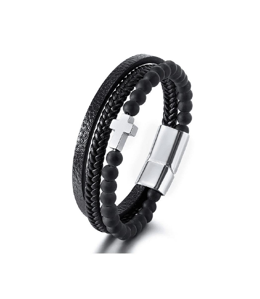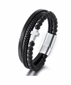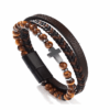 Egészítse ki megjelenését ezzel az elegáns és férfias karkötővel, amely minőségi fekete bőrből, természetes kőből készült Tiger Eye gyöngyökből és egy jellegzetes kereszt charmból készült!