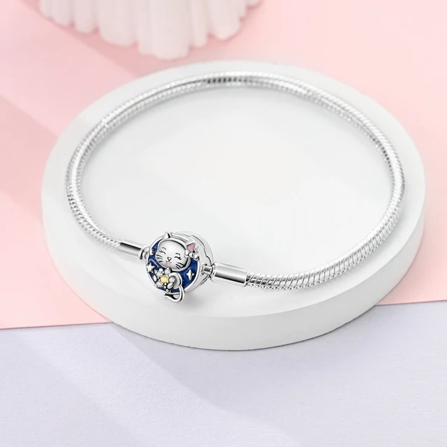 A cica charm mélykék árnyalatokban pompázik, amelyet finom arany és rózsaszín részletek egészítenek ki, amelyek mélységet és diszkrét csillogást kölcsönöznek. A charm hátterébe vésett apró virágok és csillagok egy csipetnyi nőiességet és álmodozást kölcsönöznek, így ez a karkötő igazán különleges charm.