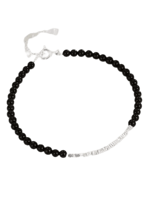 Ez a sterling ezüst karkötő arany ékezetekkel és állítható fekete zsinórral egy modern és sokoldalú kiegészítő minden alkalomra. Az aranyszínű geometrikus gyöngyökkel ellátott minimalista dizájn tökéletes egyensúlyt kínál az elegancia és a hétköznapi stílus között, és könnyen illeszkedik bármilyen öltözékhez.