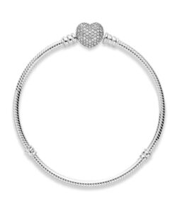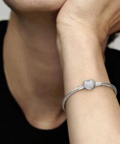 Elegáns és sokoldalú ékszer, tökéletes a nők számára, akik szeretik a személyre szabható kiegészítőket! Ez a klasszikus Pandora sterling ezüst karkötő szív alakú csattal a kifinomultság és a szerelem szimbóluma.