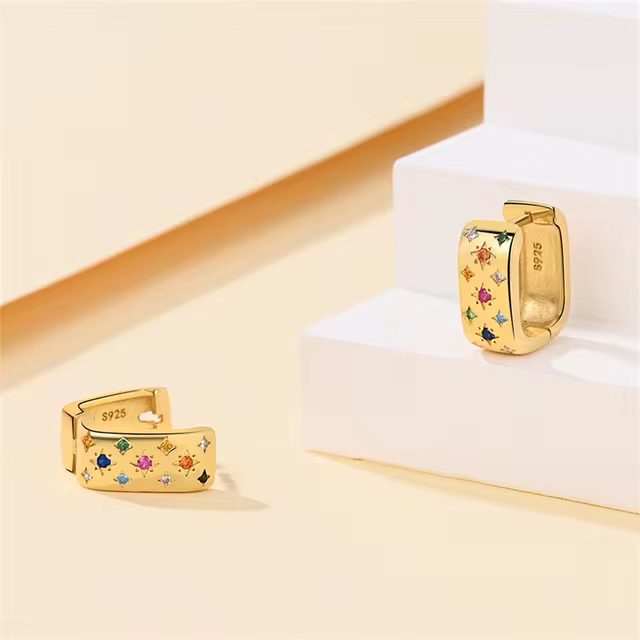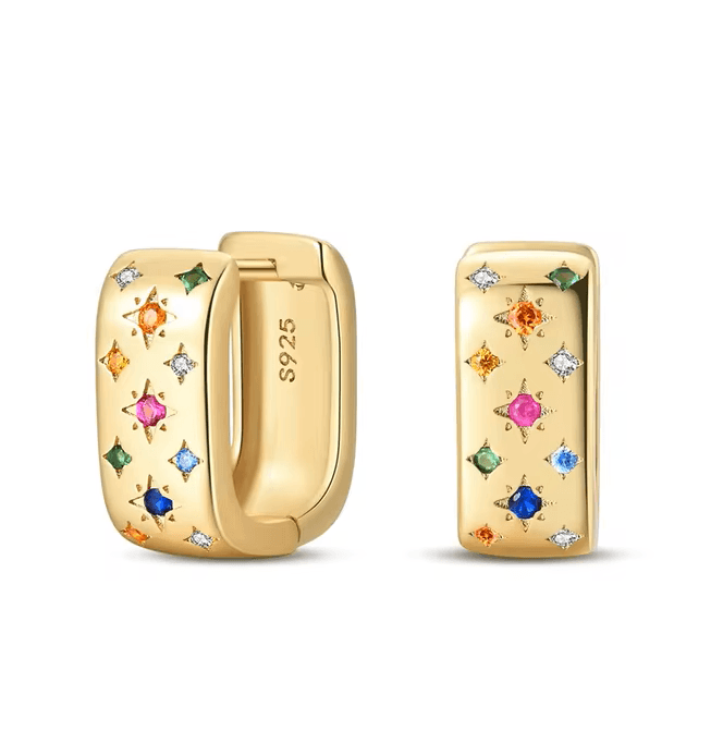 Fedezd fel ezeket a stílusos és vidám fülbevalókat modern dizájnnal és többszínű részletekkel, amelyek minden mozdulatnál megragadják a fényt. Az aranyozás kifinomult hatást kölcsönöz, míg az apró színes csillagok játékos és kifinomult vizuális hatást keltenek.