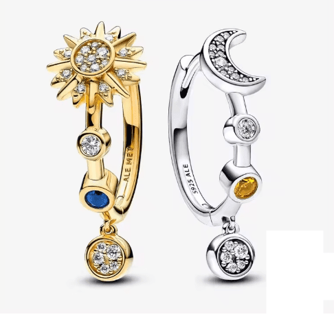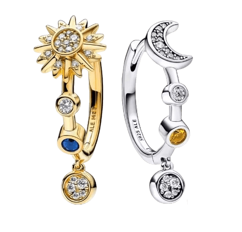 Egyedi design: Aszimmetrikus pár – az egyik fülbevaló a Hold, a másik a Nap alakjában, a fény és a sötétség közötti egyensúlyt szimbolizálva.