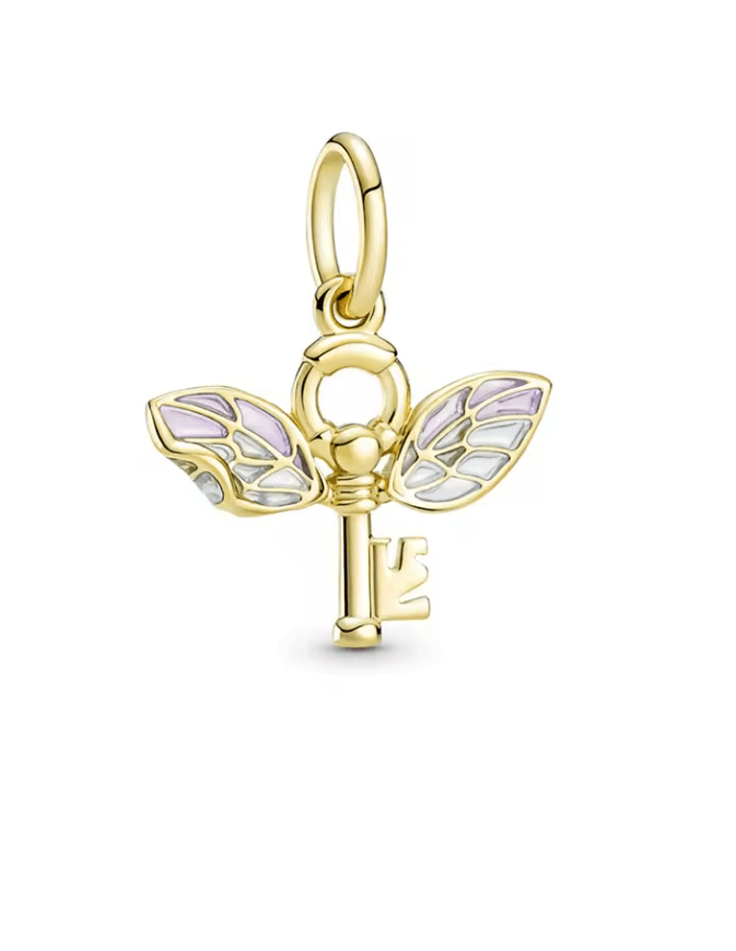 Fedezze fel a szabadság és a szerelem szimbólumát ezzel az egyedi , elegáns, színes pillangószárnyakkal díszített kulcs formájú medállal . A kifinomult dizájn és az aranyszínű részletek remek kiegészítője bármely karkötőnek vagy nyakláncnak.