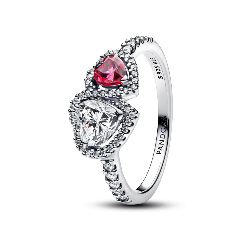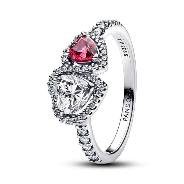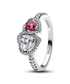 Látványos, sterling ezüstből készült gyűrű, melyet két háromszög alakú szív alakú kővel – egy fehér és egy piros – díszített, melyet finom kristálykorona keretez. A romantikus és modern design eleganciát, szerelmet és kifinomultságot sugároz.