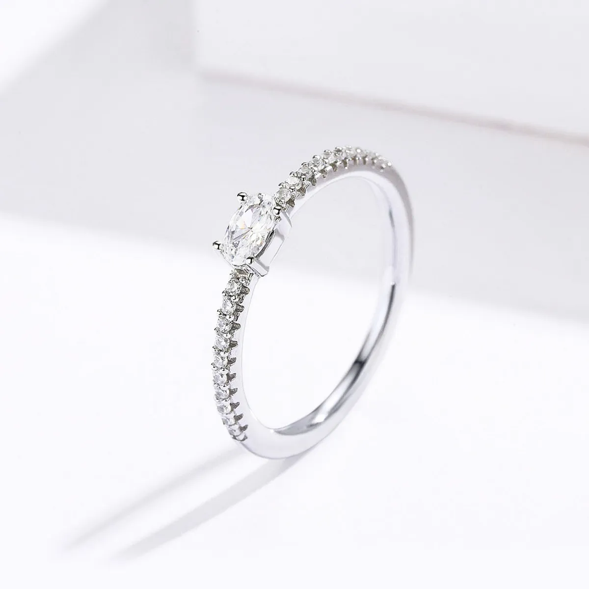 Válassza ennek a finom sterling ezüst gyűrűnek a visszafogott kifinomultságát, klasszikus, teljes szalagkialakítású, négy kerek karomban elhelyezett szintetikus cirkóniával díszített gyűrűt. A középső kő szikrázó csillogása a tisztaság és az örök szerelem szimbóluma, április – a gyémánt hónapja – előtt tiszteleg.