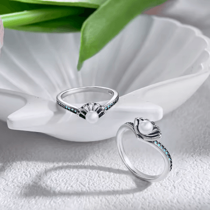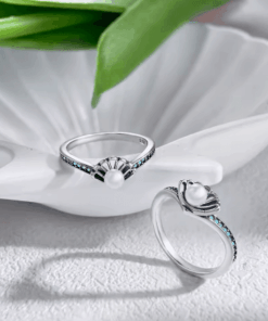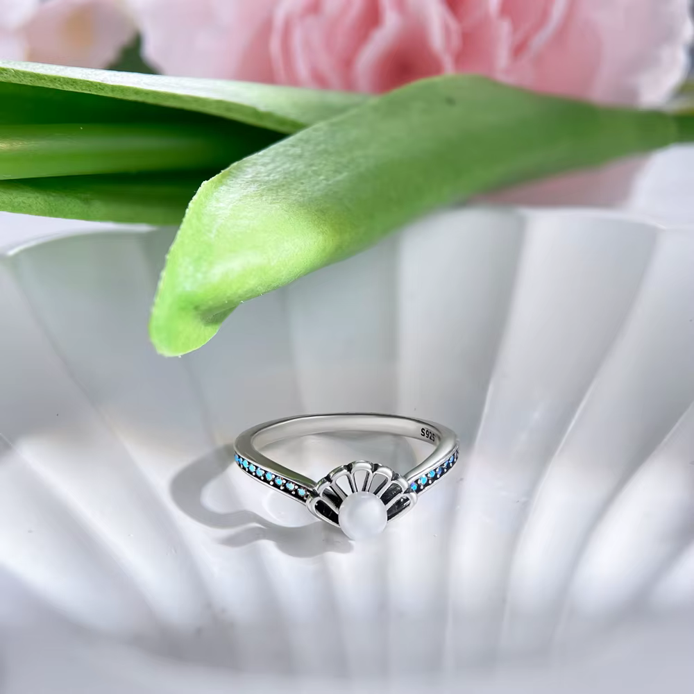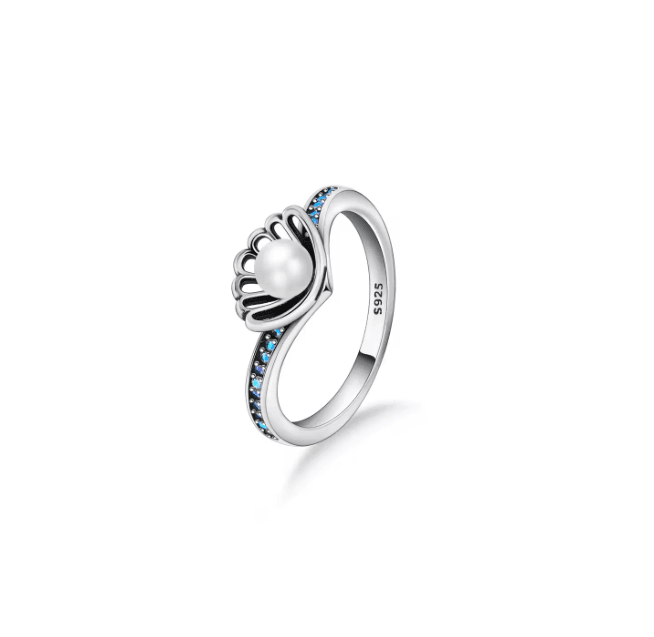 Az óceán szépsége ihlette ezt a kifinomult gyűrűt, amely a természetes gyöngy eleganciáját a stilizált kagyló finom részleteivel ötvözi. Sterling ezüstből készült, és apró kék kristályokkal van díszítve, amelyek kifinomultságot és diszkrét csillogást kölcsönöznek. Aszimmetrikus és modern kialakítása miatt bármilyen alkalomra tökéletes – egy elegáns partitól kezdve egy olyan napig, amikor különlegesnek akarod érezni magad.