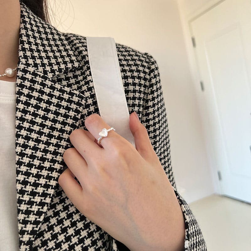 Ezt az állítható sterling ezüst gyűrűt minimalista és kifinomult dizájn határozza meg, amely tökéletes bármilyen alkalomra. A finom kis szívecskével és szabálytalan geometriai formával ellátott kiegészítő eleganciát és finomságot kölcsönöz minden öltözéknek.