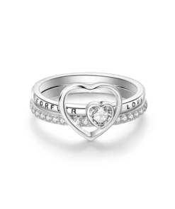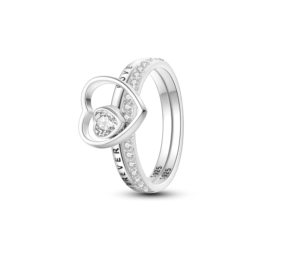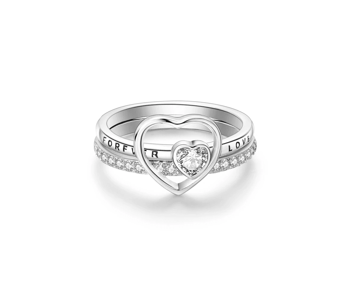 A végtelen szerelem szimbóluma ez a gyönyörű gyűrű, amely kettős kialakításával nyűgöz le: egy elegáns szív, amely egy csillogó kristályt vesz körül, kiegészítve egy „”FOREVER LOVE”” feliratú, csillogó kövekkel kirakott láncszemmel.