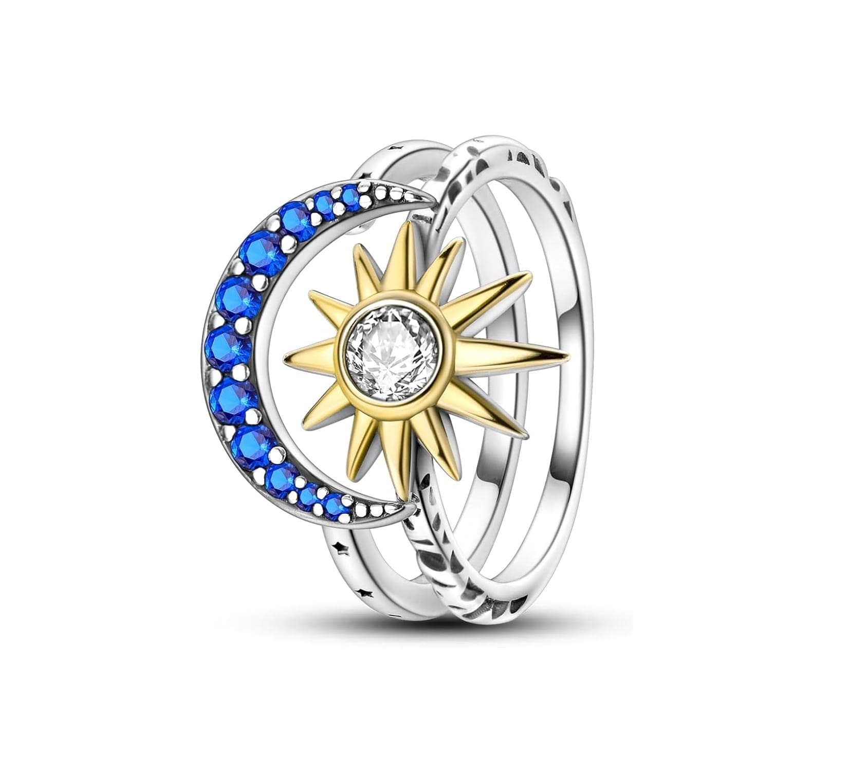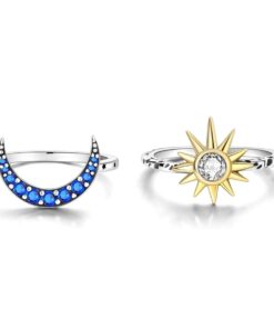 Fedezze fel az égbolt szépsége által ihletett ékszerkészletet – két elegáns 925-ös sterling ezüst gyűrű, csillogó mesterséges cirkóniával és a Napot és a csillagokat ábrázoló finom részletekkel díszítve. Együtt vagy külön-külön is viselhetők, varázslatos hangulatot kölcsönözve bármilyen öltözéknek.
