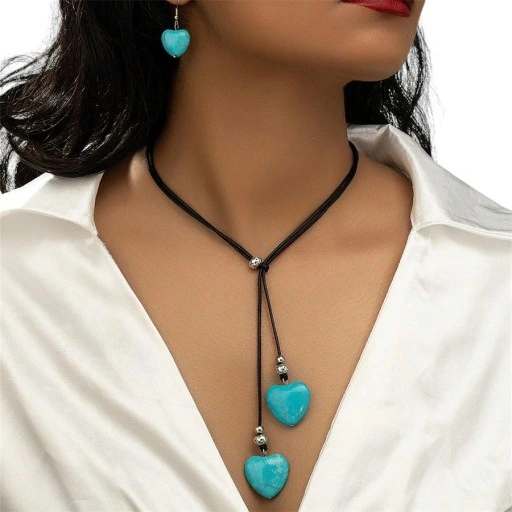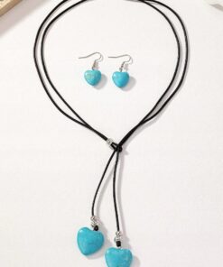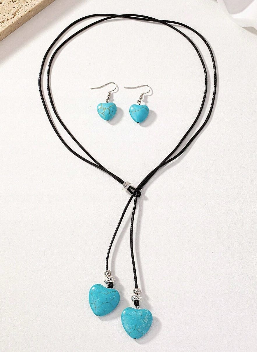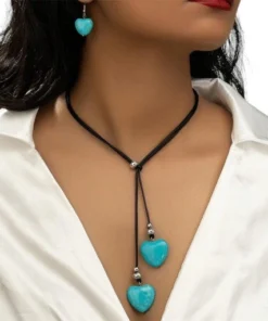 Állítható fekete zsinórnyaklánc, két türkizkék természetes kőből készült szívvel díszítve.
