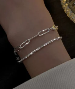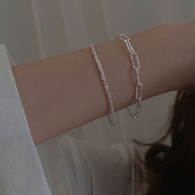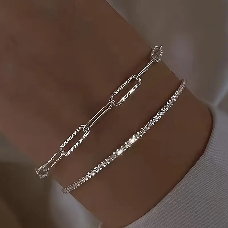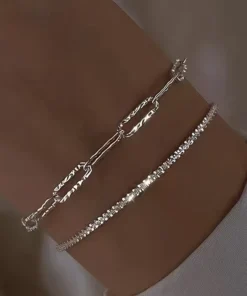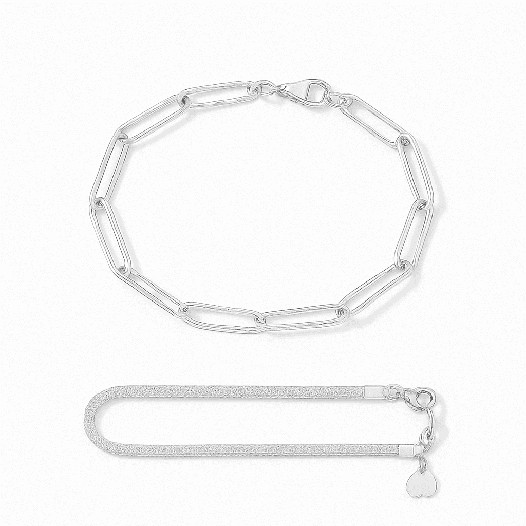 Set brățări elegante cu aspect strălucitor – un duo modern compus dintr-o brățară cu zale alungite, texturate, și o brățară suplă cu finisaj lucios și sclipiri discrete. Perfecte purtate împreună sau separat, aceste brățări adaugă un plus de rafinament oricărei ținute, fie că optezi pentru un look casual sau elegant.