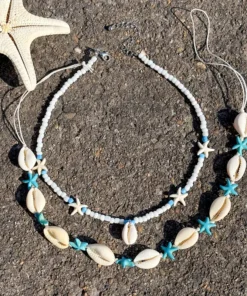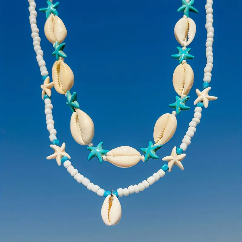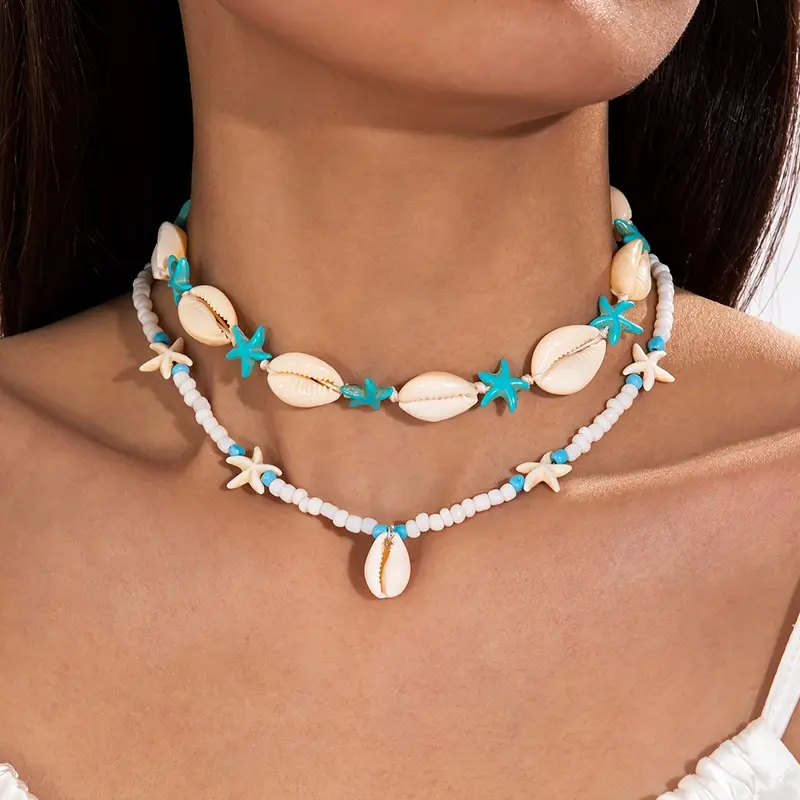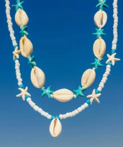 Engedd, hogy a nyár hullámai magával ragadjanak ezzel az óceán szépsége által inspirált nyaklánc készlettel . Két rétegelt nyakláncból áll – egy kagylós és kék csillagokkal díszített choker , valamint egy hosszú choker gyöngyökkel és medállal – ez a kiegészítő tökéletes az egzotikus, laza és vibrálómegjelenéshez.