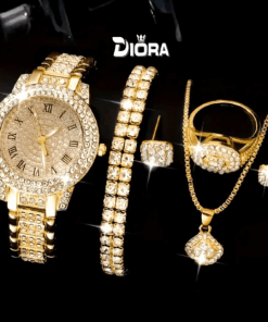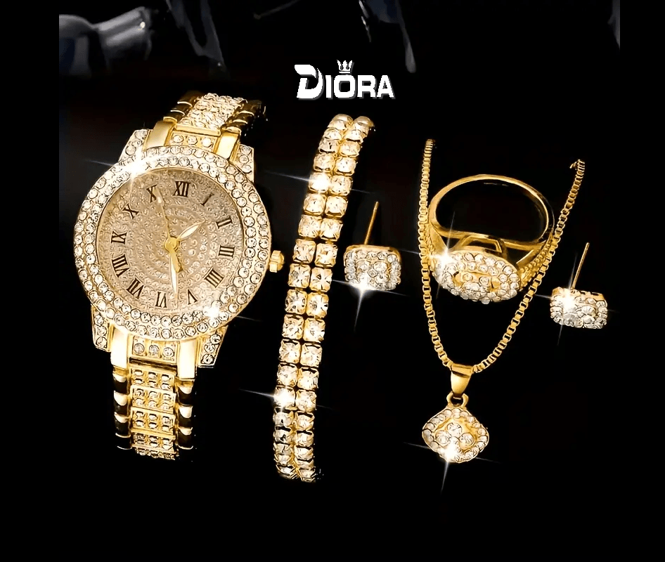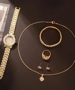 Fedezze fel az elegáns 6 az 1-ben szettet – óra és a hozzá tartozó ékszerek, amelyek tökéletesek különleges alkalmakra, kifinomultságot és csillogást kölcsönöznek öltözékének.